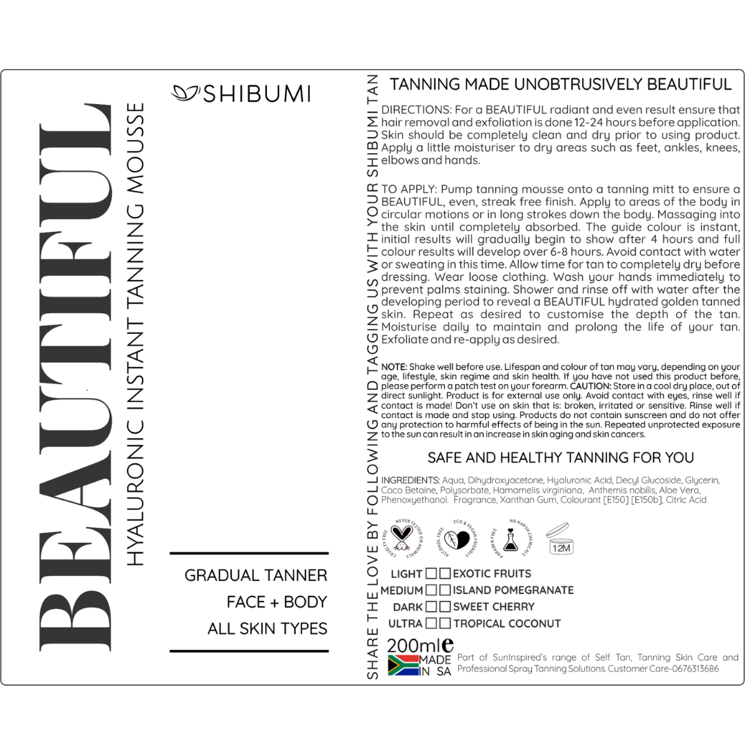 BEAUTIFUL Self Tanning Mousse is perfect for all you ladies wanting the ultimate home self tanning golden glow .This decedent, fast drying self-tan is easily applied using a tanning mitt. To achieve an instant, rich tan with no streaks and no mess. Simply shake the bottle and pump away!