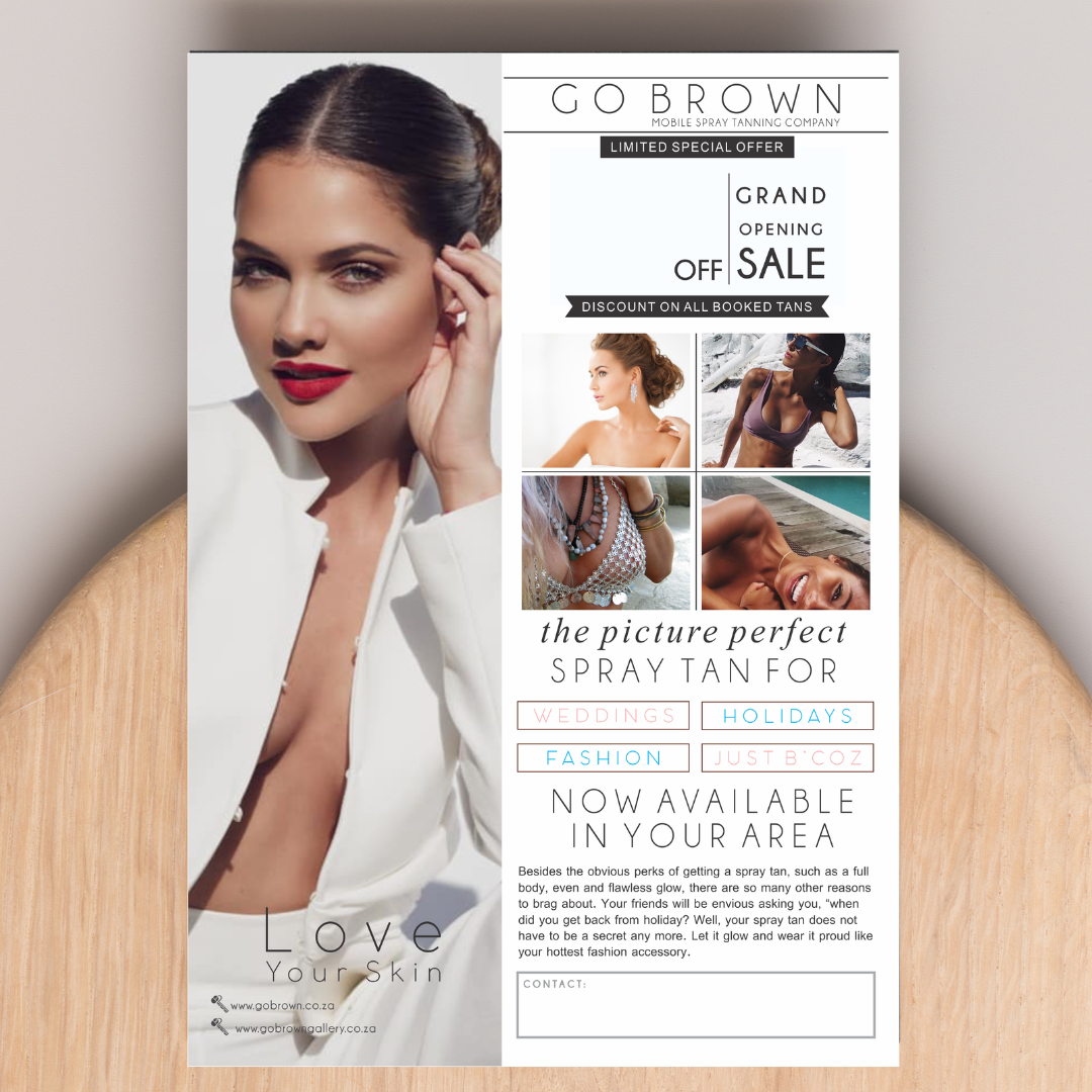 Provided in a packs of 25, 50, 75, 100 and 150, you can feel confident in building awareness and interest when you share you Spray Tan Business Flyers them around your local gyms, hairdressers, and favourite coffee shop to help generate the ultimate exposure within your area to advertise your skills as a Go Brown spray tan technician.